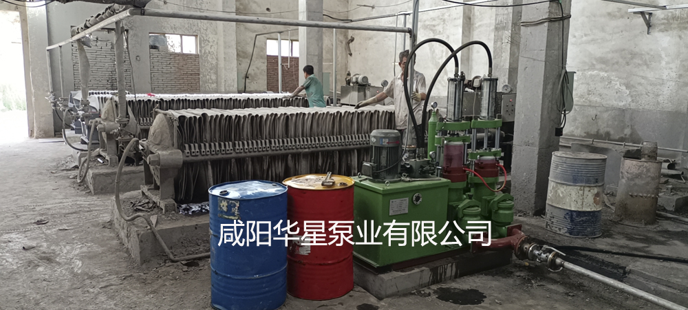 一臺華星柱塞泥漿泵給4臺壓濾機進料